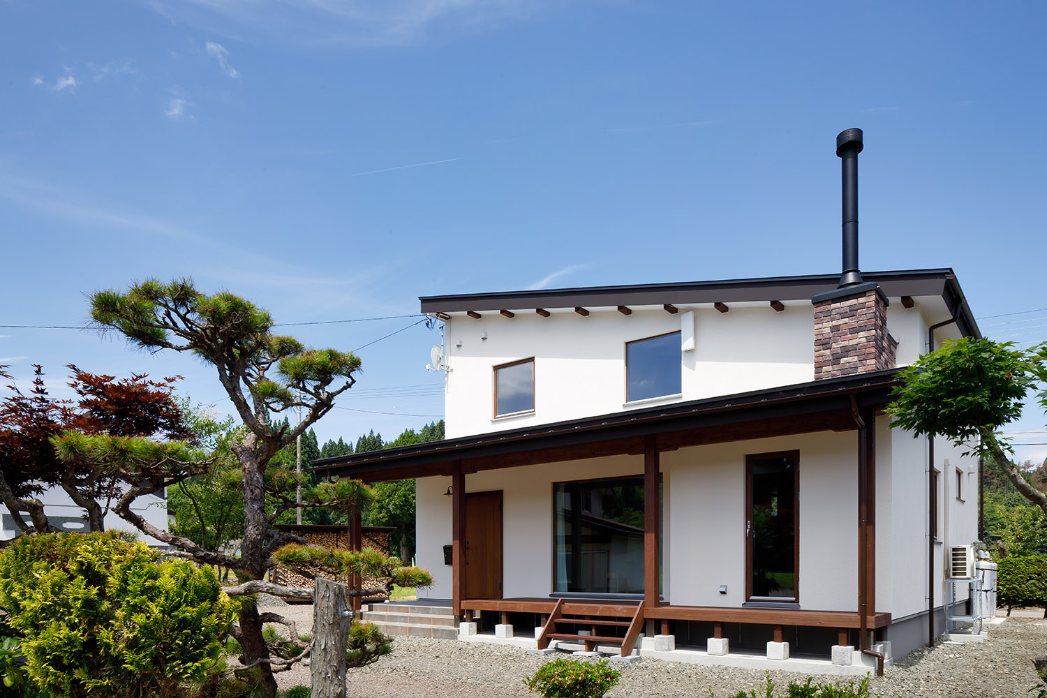 リビング土間からつながるウッドデッキには大きな軒がかかり、真夏の強い日射を遮り、雨や雪の日でもウッドデッキの用途を広げている。