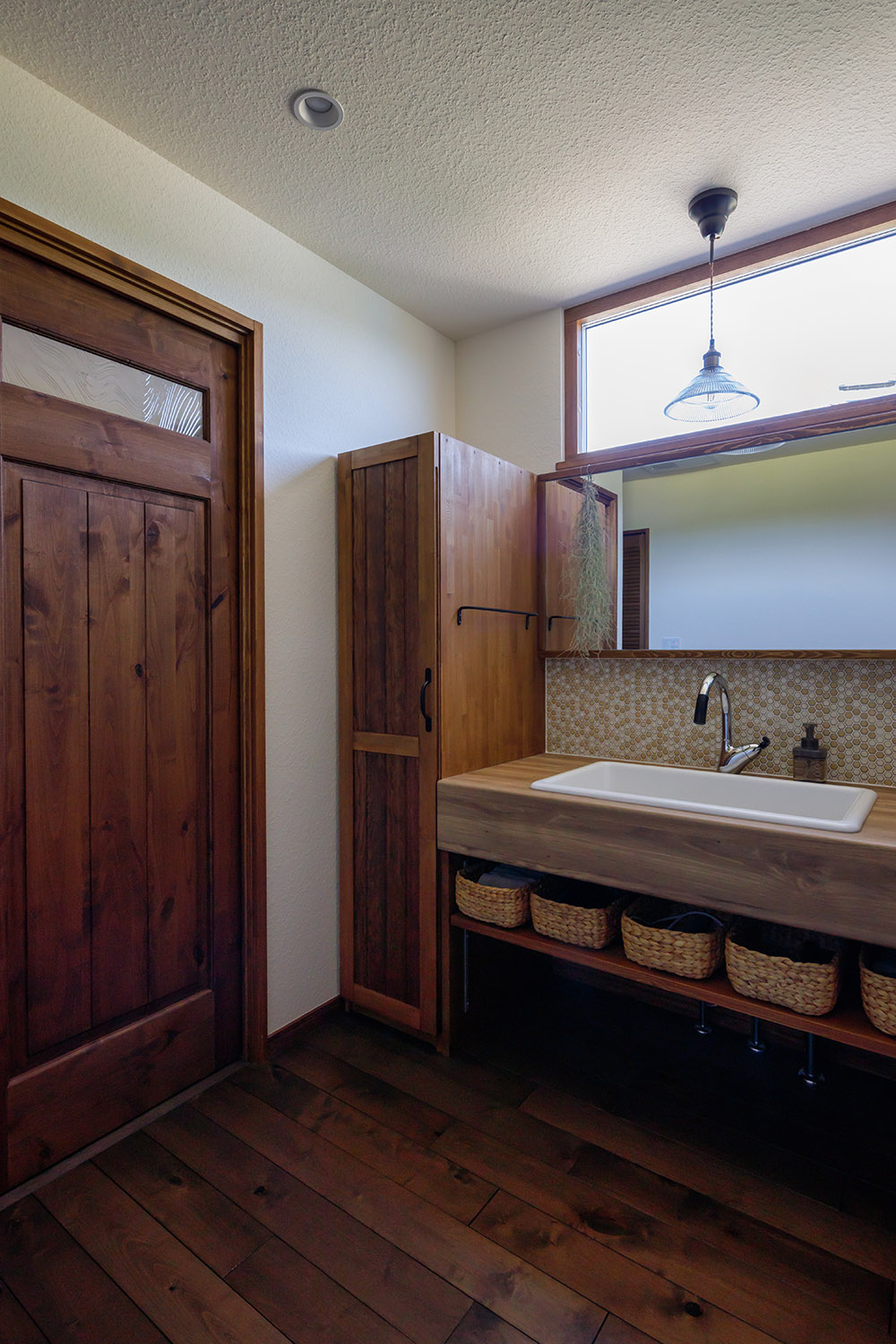 アンサーの定番である造作の独立洗面台。壁面のタイルは家族で選んだ。