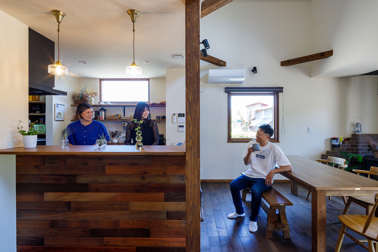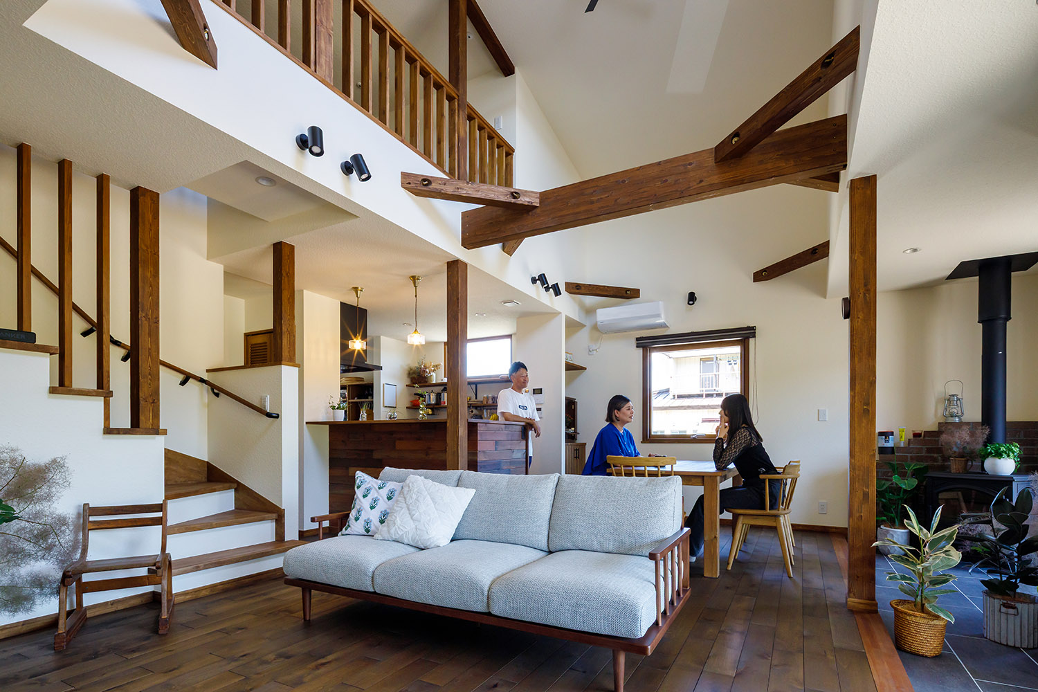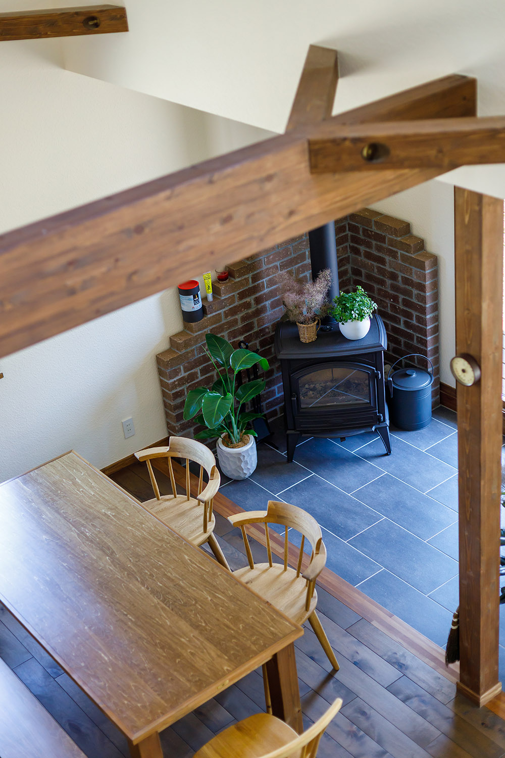 2階フリースペースからダイニングと土間の薪ストーブを見る。柱や梁、床の無垢材と土間のタイルといった異素材のバランスもKさん家族のお気に入り。