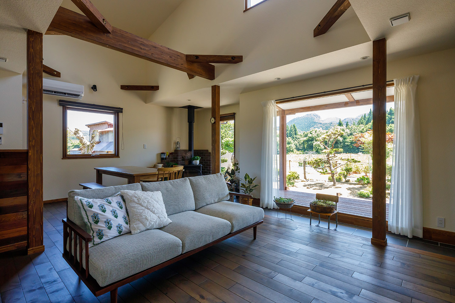 土間を暮らしに取り込んだLDK。土間には薪ストーブに加えて観葉植物が並ぶ。2階フリースペースともつながる大きな吹き抜けが開放的。