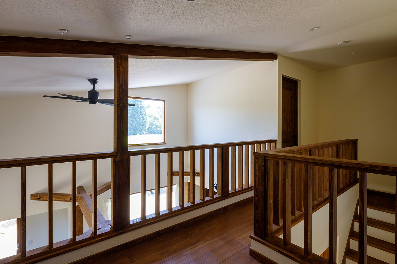 吹き抜けとつながる2階フリースペース。リビングの高窓からの景色を一望できる。