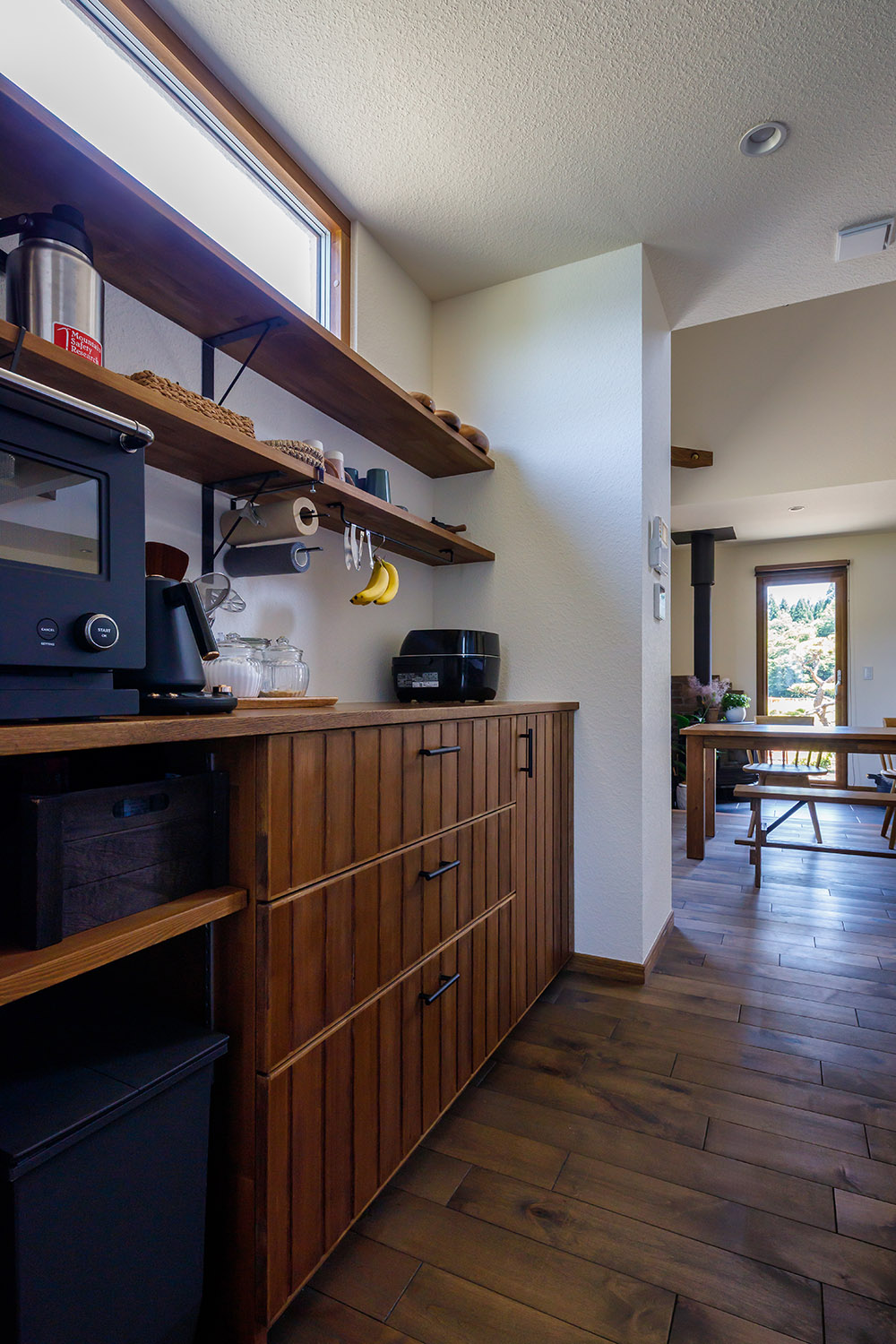 造作収納を配置したキッチンの作業動線。ダイニングを通して窓の外には自然が広がり、Kさんのお気に入りのアングル。