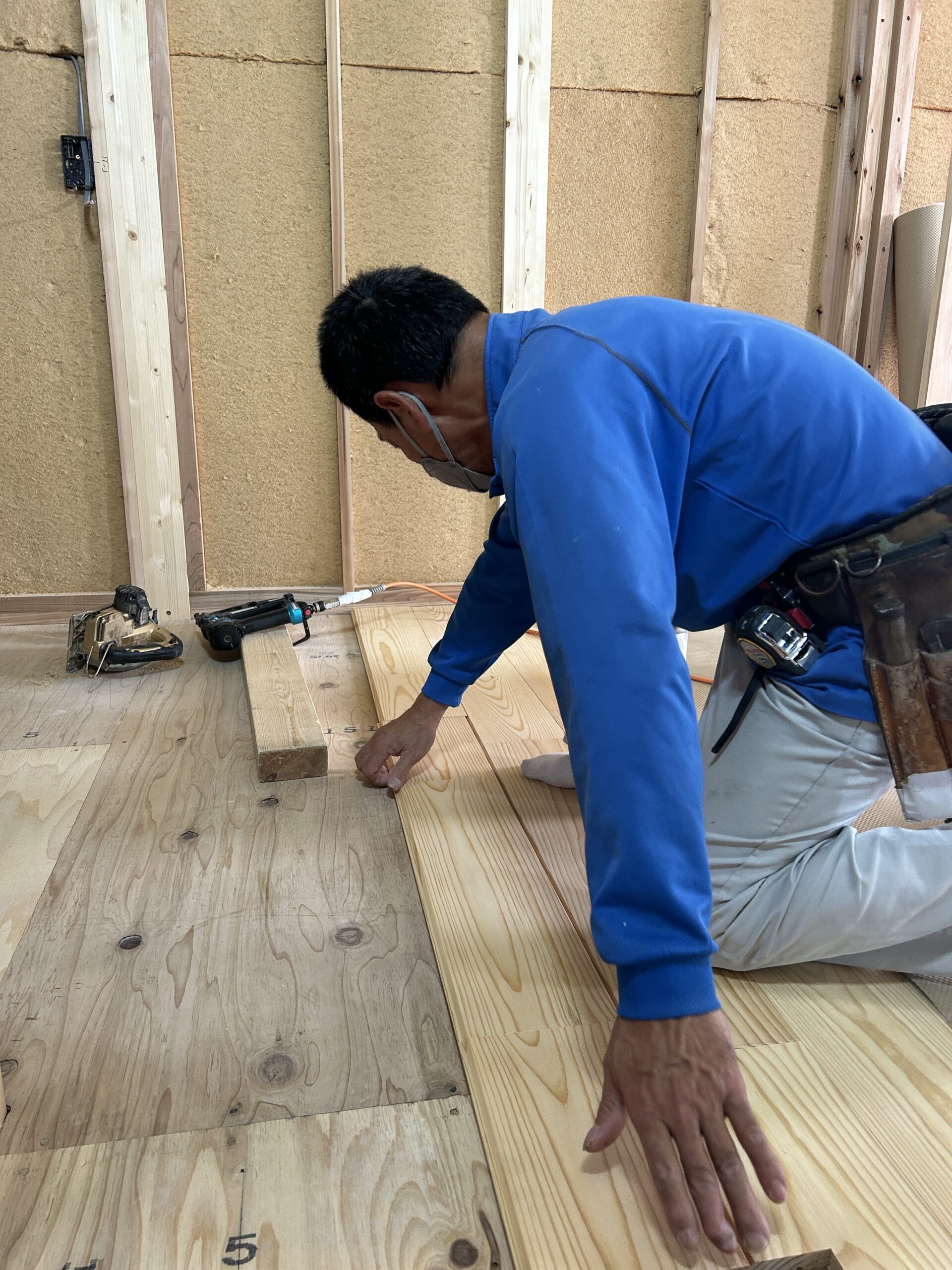 無垢のフロア材を1枚1枚丁寧に張っていきます