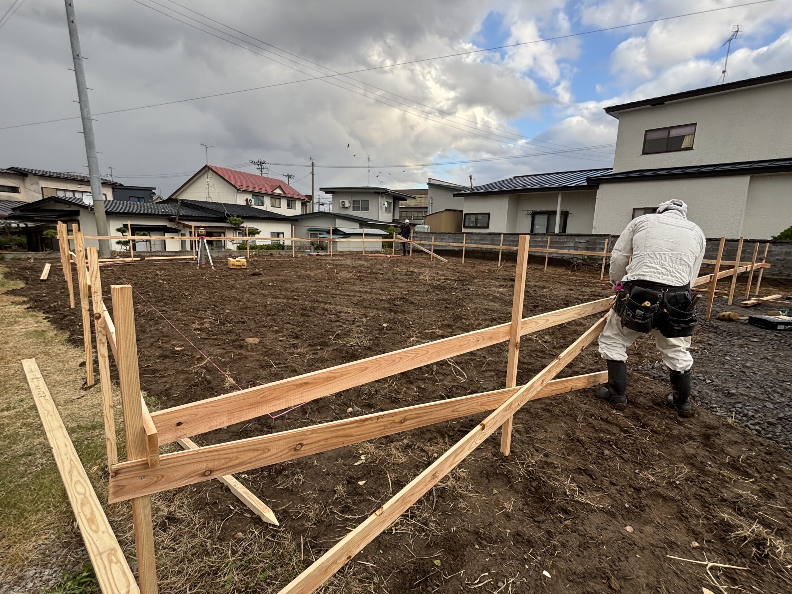 基礎工事の前に、 実際の建築物の位置・高さ・水平の基準となる仮設の工作物を設置してきました。図面から実際の敷地に反映させるための重要な工程になります。