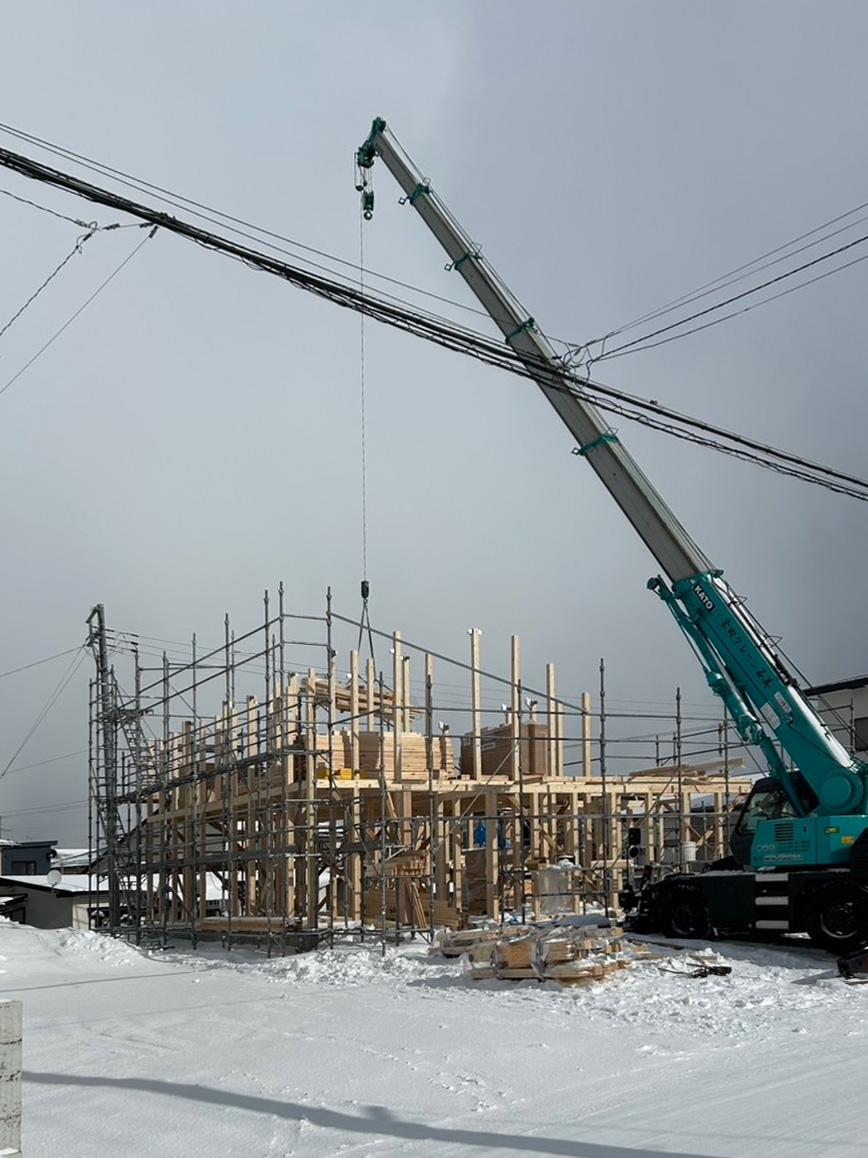 本日より クレーンをいれて「建て方」を行っています。寒波の最中でしたが十分に注意をして作業を行いました。